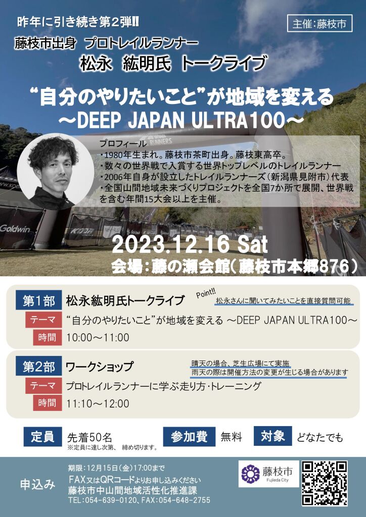 2023年12月16日 (土) 静岡県藤枝市「藤の瀬会館」にて、藤枝市出身のプロトレイルランナー松永紘明によるトークライブ「”自分のやりたいこと”が地域を変える」を開催いたします。