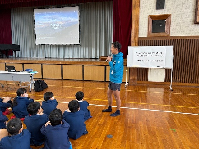 「夢授業」は、45分×1限で行われました。トレイルランナーズが取り組むSDGsについて、持続可能な大会の運営方法はもちろん、それを通じた環境教育などについてお伝えしました。
